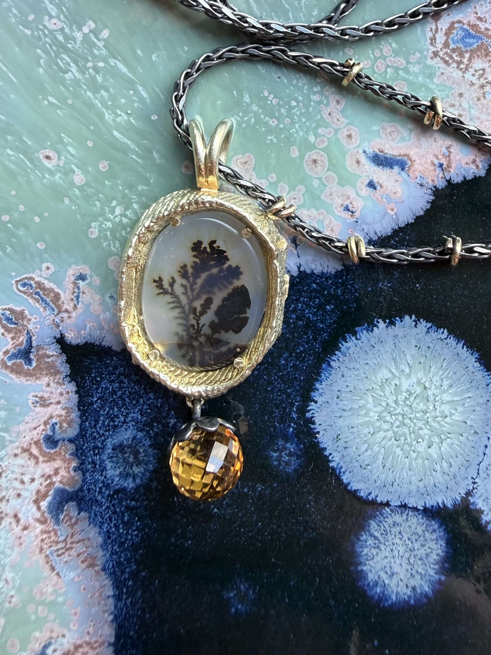 Hanger met dendriet agaat in 14k lijst en citrien.